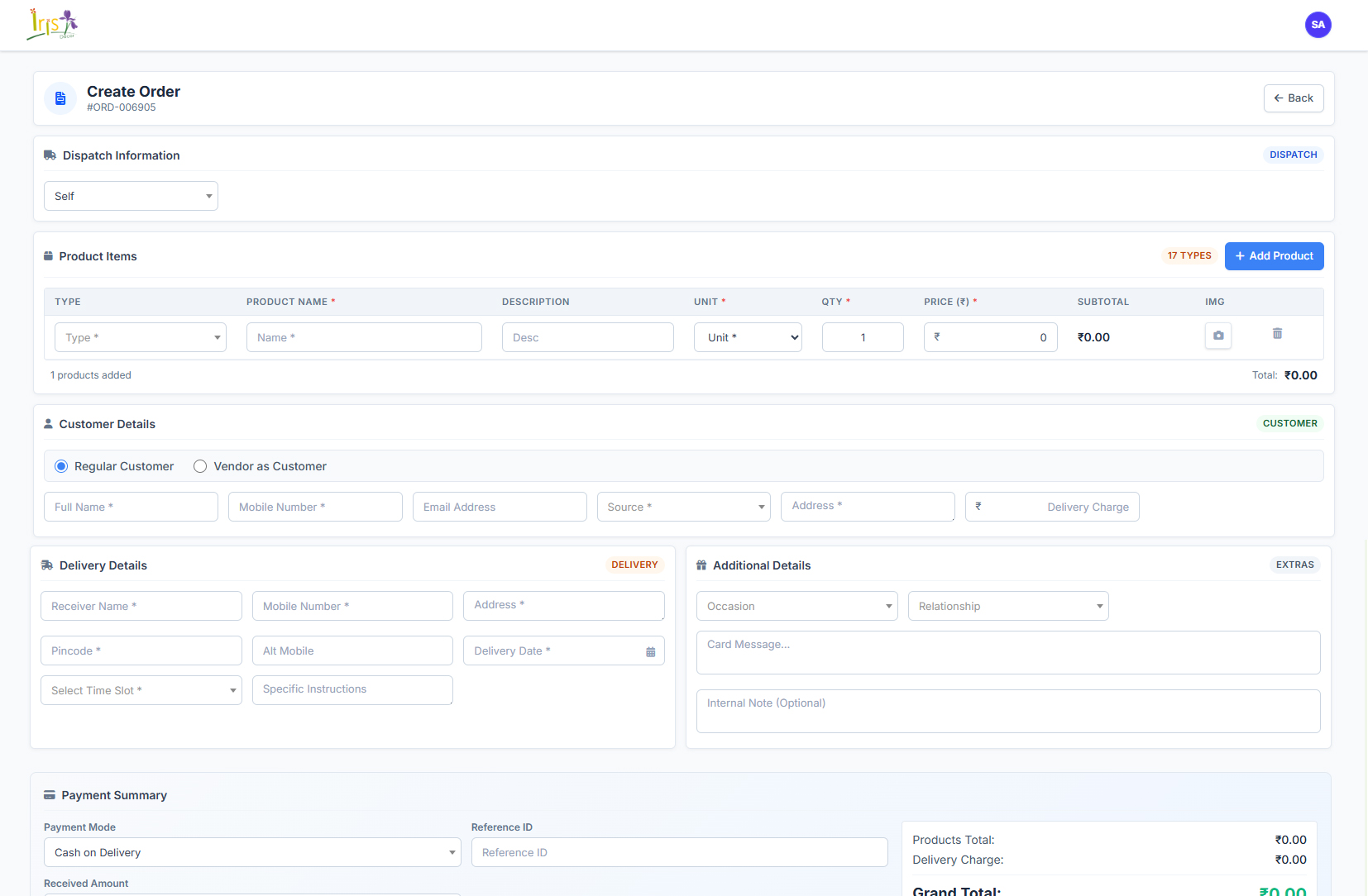 Users can create orders received through different channels, such as email, WhatsApp, and phone calls. The panel allows users to input all necessary order details, ensuring that no order is missed or incorrectly recorded. This feature helps consolidate orders from various sources into a single system for better management and tracking.