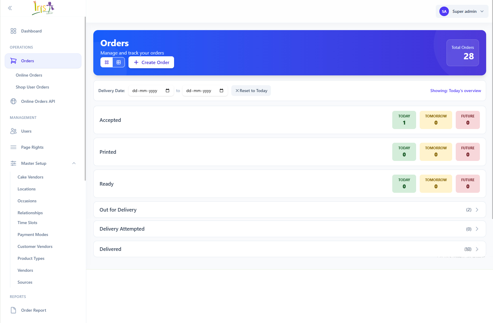 Users can create orders received through different channels, generate professional invoices automatically, and manage order status through various stages from "Received" to "Delivered." The system enables you to assign orders to specific delivery boys based on availability and delivery routes, optimizing your delivery operations.
